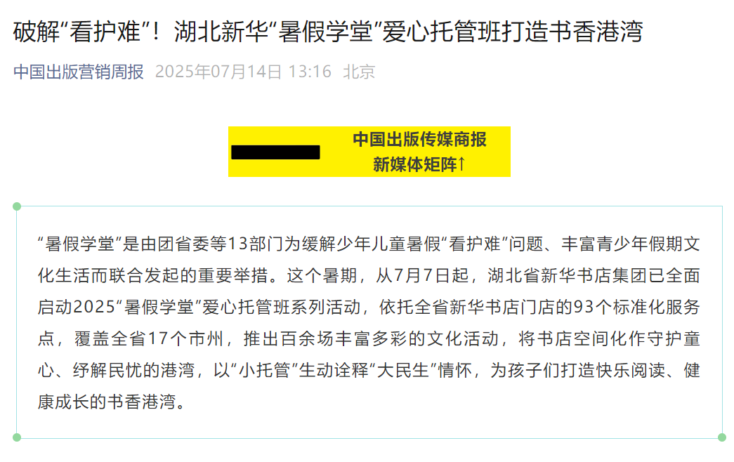 中國出版營銷周報 | 破解“看護難”!湖北新華“暑假學(xué)堂”愛心托管班打造書香港灣